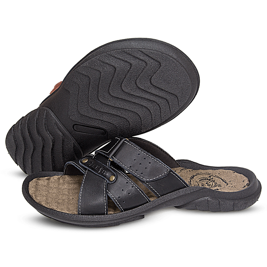 Chinelo Masculino de Couro Bovino, com Palmilha de P.U. revestida em Camurça. Indicado para finais de semanas em seus momentos de lazer.